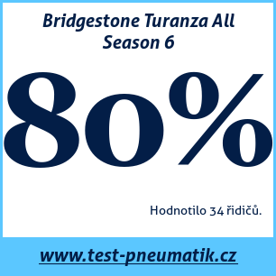 Bridgestone Turanza All Season 6 – recenze celoroční pneumatiky Bridgestone Turanza All Season 6, kterou hodnotilo 20 uživatelů a dali jí celkovou známku 81 %. Tato pneumatika je nejčastěji testována v rozměrech 225 45 R17, 225 40 R18, 205 55 R16.