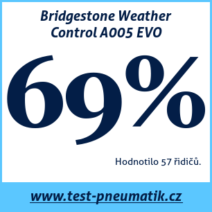 Bridgestone Weather Control A005 EVO – recenze celoroční pneumatiky Bridgestone Weather Control A005 EVO, kterou hodnotilo 51 uživatelů a dali jí celkovou známku 70 %. Tato pneumatika je nejčastěji testována v rozměrech 225 45 R17, 205 55 R16, 225 40 R18.