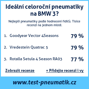 Pokud máte vlastní web s tématikou automobilů, nebo jste dodavatelem pneumatik, můžete na svůj web umístit naši plaketu s hodnocením pneumatik vhodných pro vůz BMW 3: Test pneumatik na BMW 3 [png] ![]()
