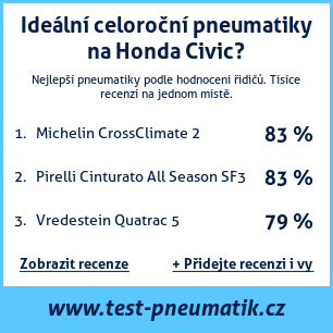 Pokud máte vlastní web s tématikou automobilů, nebo jste dodavatelem pneumatik, můžete na svůj web umístit naši plaketu s hodnocením pneumatik vhodných pro vůz Honda Civic: Test pneumatik na Honda Civic [png] ![]()