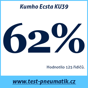 Kumho Ecsta KU39 KumhoKumho Ecsta KU39 – recenze letní pneumatiky Kumho Ecsta KU39, kterou hodnotilo 151 uživatelů a dali jí celkovou známku 78 %. Tato pneumatika je nejčastěji testována v rozměrech 225 45 R17, 205 45 R17, 215 45 R17.