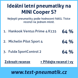Pokud máte vlastní web s tématikou automobilů, nebo jste dodavatelem pneumatik, můžete na svůj web umístit naši plaketu s hodnocením pneumatik vhodných pro vůz MINI Cooper S: Test pneumatik na MINI Cooper S [png] ![]()