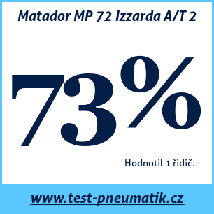 Matador MP 72 Izzarda A/T 2 MatadorMatador MP 72 Izzarda A/T 2 – recenze pneumatik na vozidlo SUV, nebo 4x4 Matador MP 72 Izzarda A/T 2, kterou hodnotilo 1 uživatelů a dali jí celkovou známku 73 %. Tato pneumatika je nejčastěji testována v rozměrech 245 70 R16.