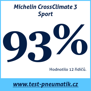 Michelin CrossClimate 3 Sport MichelinMichelin CrossClimate 3 Sport – recenze celoroční pneumatiky Michelin CrossClimate 3 Sport, kterou hodnotilo 8 uživatelů a dali jí celkovou známku 92 %. Tato pneumatika je nejčastěji testována v rozměrech 245 40 R19, 225 40 R18, 245 45 R19.