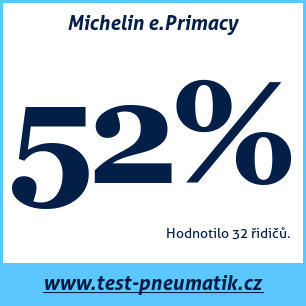 Michelin e.Primacy – recenze letní pneumatiky Michelin e.Primacy, kterou hodnotilo 26 uživatelů a dali jí celkovou známku 66 %. Tato pneumatika je nejčastěji testována v rozměrech 235 45 R18, 205 55 R16, 225 45 R17.